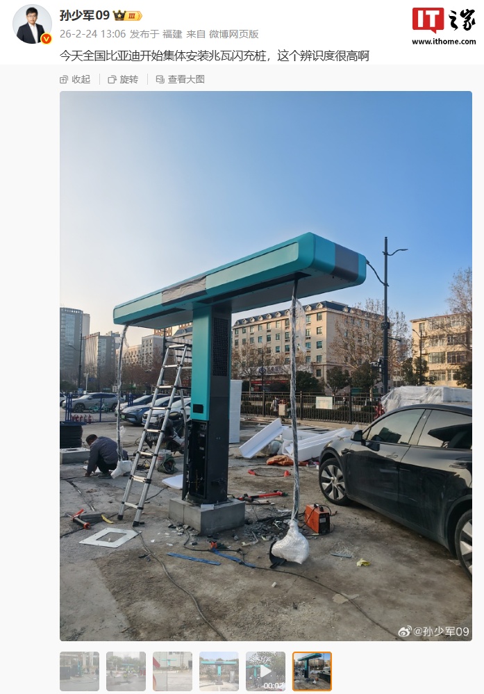 IT之家 2 月 24 日消息,据博主 @孙少军09 分享,今天全国比亚迪开始集体安装兆瓦闪充桩。相关图片显示,充电桩采用青色外观 +“T”字形方案设计,极具辨识度。