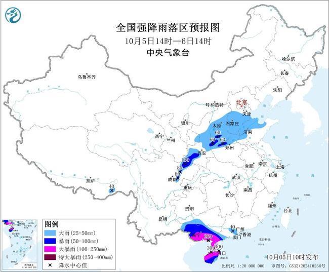 预计,10月5日14时至6日14时,海南岛、广东西南部、广西南部和西部等地部分地区有暴雨到大暴雨,局地特大暴雨(250~300毫米);此外,四川盆地中部和北部、陕西中部和南部、山西中南部、河北中南部、山东北部、河南北部等地的部分地区有大到暴雨,四川盆地北部局地有大暴雨(100~130毫米);上述部分地区伴有短时强降水,最大小时降雨量20~40毫米,华南局地可超过80毫米,并伴有雷暴大风等强对流天气。